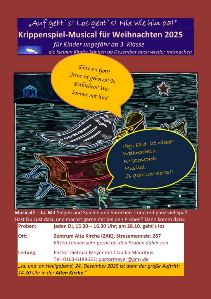 „Auf geht`s los geht`s“ – Krippenspiel-Musical 2025 für Kinder – Proben dienstags ab 28. Oktober, 15.30 – 16.30 Uhr, im Zentrum Alte Kirche (ZAK). Für Kinder ab 3. Klasse.